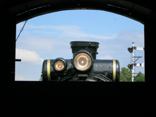屋根の向こうには、「キマロキ」の後ろの「キ」である D51 398 の前照灯が見えています。