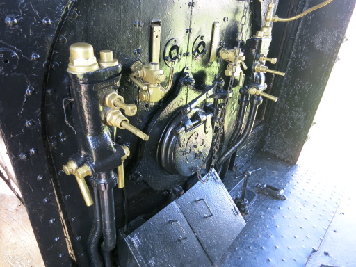 進行方向に向かって左側、蒸気機関車だと機関士側の場所に、座面だけの椅子が備え付けられていました。左には、まるで蒸気機関車のような「釜」(ボイラー)も見えます。このロータリー車は自走できませんが、タービンを回すために蒸気機関を搭載しています。「釜」の蓋は「59601」と同様に封印されています。小動物の侵入を防ぐ、などの理由があるのでしょうね。